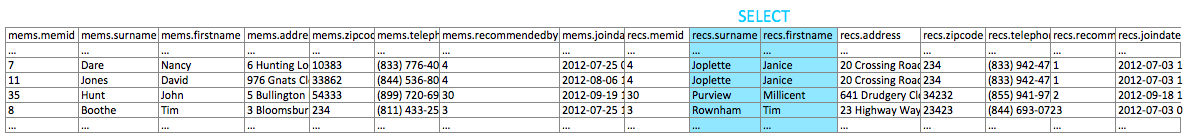 Note that while we might have two 'surname' columns in the output set, they can be distinguished by their table aliases. Once we've selected the columns that we want, we simply use DISTINCT to ensure that there are no duplicates.